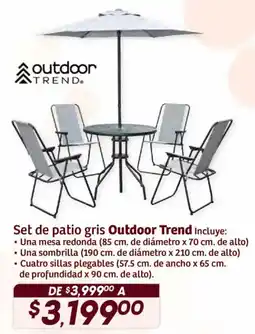 Actualmente hay varias promociones activas para Outdoor Trend, disponibles en Soriana Híper y otras cadenas reconocidas. Las promociones más comunes incluyen formatos como Lleva 2 por $50, 20% de descuento o LLEVE 3 PAGUE 2. Estas ofertas aplican en productos destacados como Outdoor trend set de patio gris, Outdoor trend mesa de resina blanca y Outdoor trend mesa resina con grifo. Con los filtros puedes seleccionar fácilmente la presentación, el tipo de empaque o tu tienda favorita para encontrar la mejor opción.