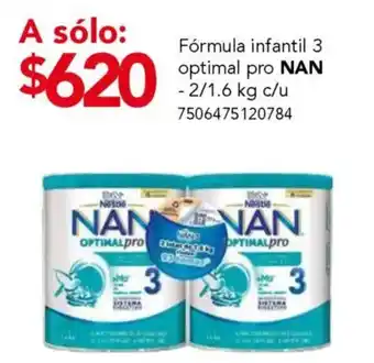 Esta oferta está disponible en varias tiendas, checa todos los productos para obtener la Nan Optimal Pro 3 más barata. Si deseas saber si este producto tiene un mayor descuento en otra tienda, consulta la categoría 'Supermercados'. También puede ser que te interesen estas ofertas: Nan Optimal Pro 1 760G, Nan 3 Optimal Pro 720+80 Gr y Nan 3 optimal pro fórmula infantil 1 a 2 años 1.2kg.