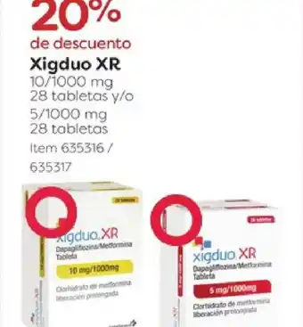 Esta oferta está disponible en varias tiendas, checa todos los productos para obtener la Xigduo XR más barata. Si deseas saber si este producto tiene un mayor descuento en otra tienda, consulta la categoría 'Mayoreo'. También puede ser que te interesen estas ofertas: Xigduo xr 10/1000mg 14 tabletas, Xigduo xr 5mg/1000mg 28 tabs y Xigduo xr 10mg/1000mg 28 tabs.