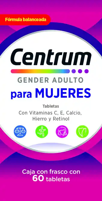 Esta oferta está disponible en varias tiendas, checa todos los productos para obtener la CENTRUM GENDER MUJER +50 60 TABLETAS más barata. Si deseas saber si este producto tiene un mayor descuento en otra tienda, consulta la categoría 'Farmacias y Salud'. También puede ser que te interesen estas ofertas: CENTRUM PERFORMANCE 30 TABLETAS, Centrum Formula Avanzada 30 Tabs y Mujer whitening antitranspirante aerosol.