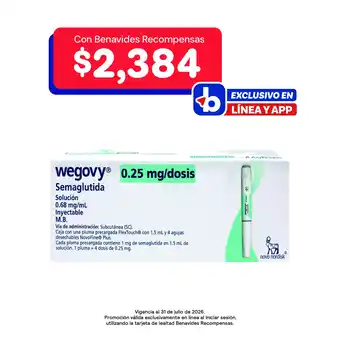 Ahora en promoción en Farmacias Benavides: 0.25 mg Semaglutida Solución Inyectable ✅ Válido desde el 21-02 hasta el 25-04.